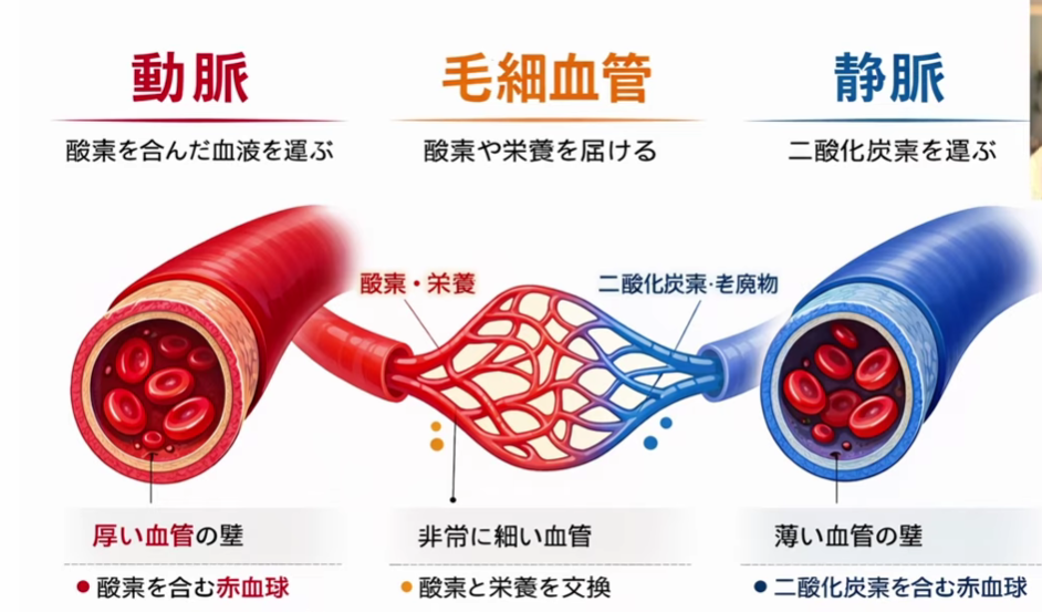 動脈と静脈を繋ぐ毛細血管は、全身の細胞に酸素や栄養を届け老廃物を回収するという役目を持っています。