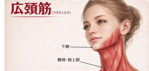 顔の下半分には広頚筋(こうけいきん)という首から顎にかけての大きな筋肉があり、この筋肉が衰えてくると皮膚を支えられなくなって重力に負けてどんどん下がってしまうからです。